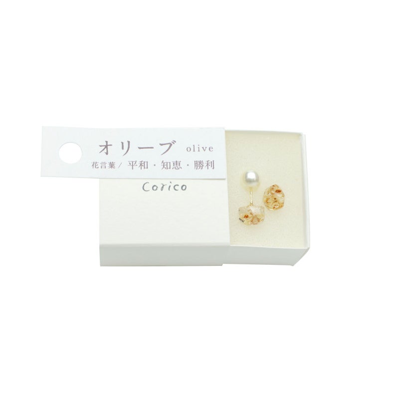 [スタイル] 1週間しか咲かないオリーブの可愛いお花を閉じ込めた小さいピアス。オフホワイトで落ち着いた色合いなのでフォーマルにもオススメ。